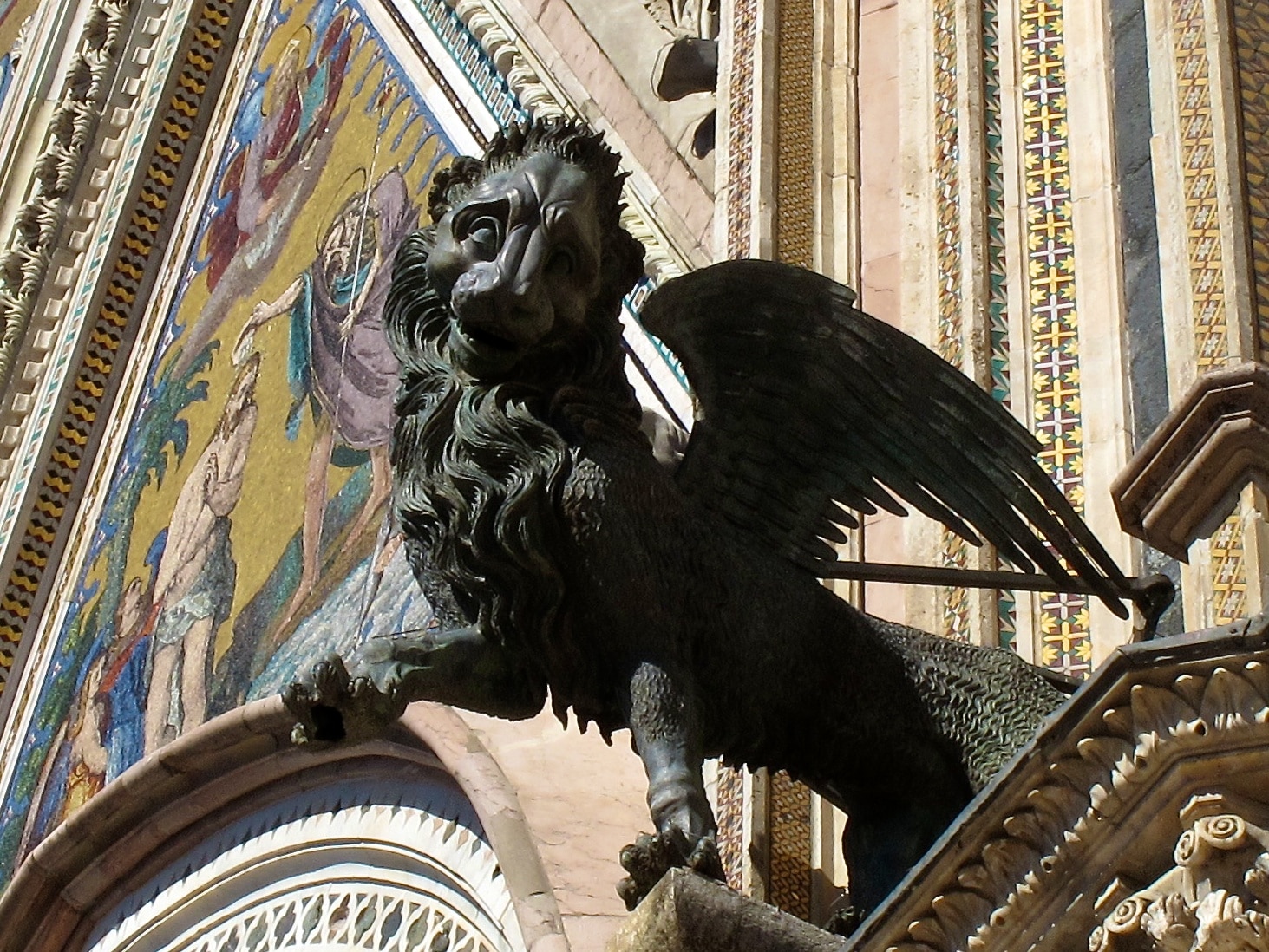 14th century bronze of the figure representing the evangelist Mark on the piers in the facade of the Duomo in Orvieto, Italy